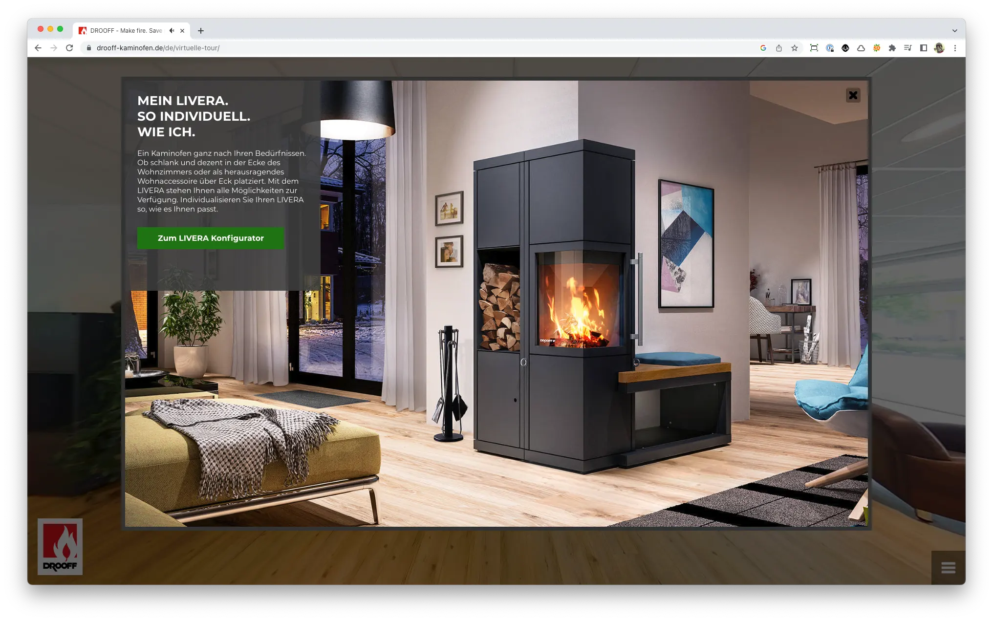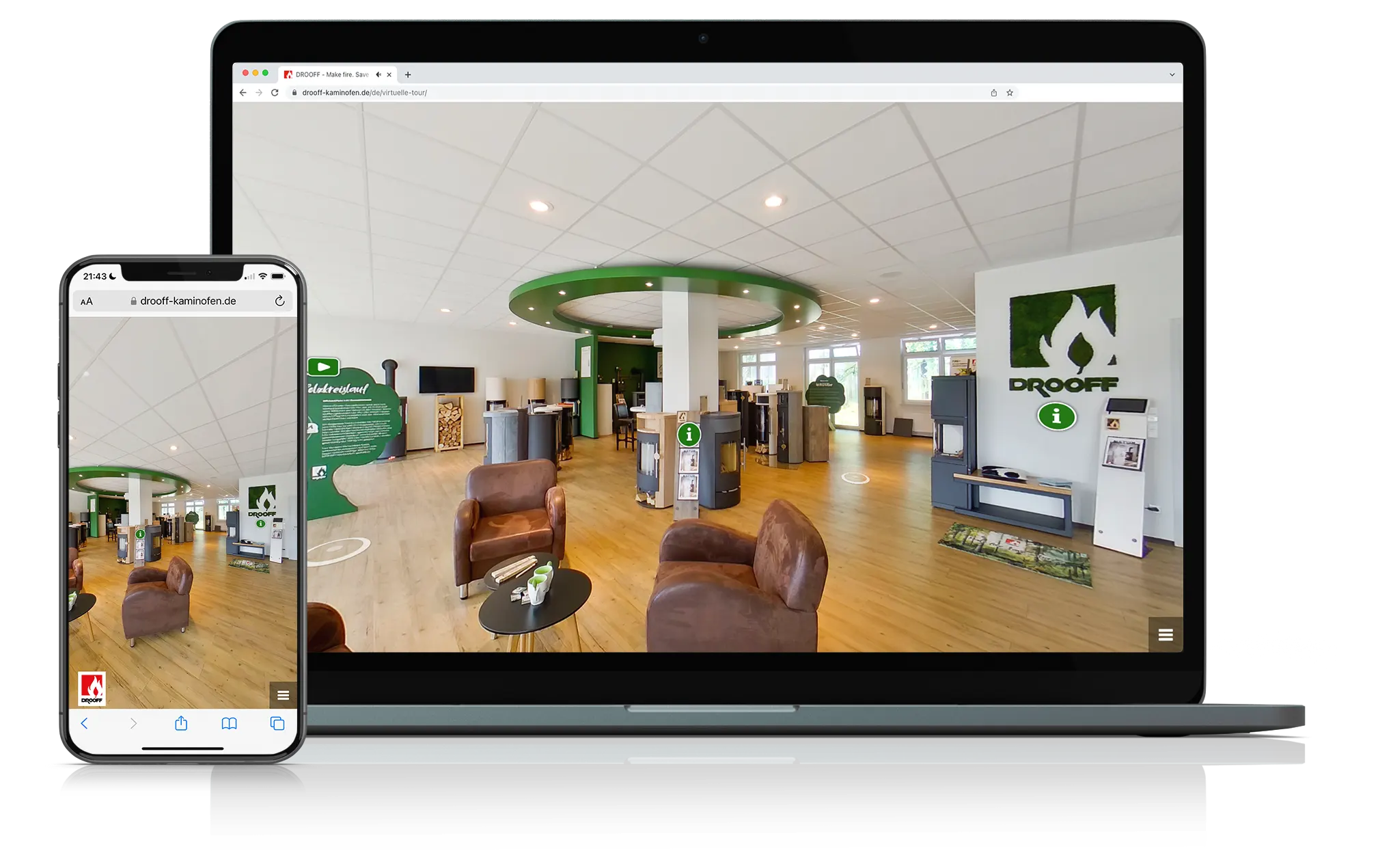 Drooff, ein Hersteller hochwertiger Kaminöfen mit eigenem Showroom, hat während der Corona-Pandemie eine virtuelle Tour seines Showrooms realisiert. ROCKET 77 übernahm hierfür die Fotografie und Programmierung in Zusammenarbeit mit Artist MesseService.
